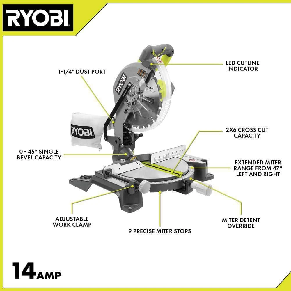 RYOBI introduces the 10 in. Compound Miter Saw with LED. The heavy duty 14 Amp motor delivers up to 5,500 RPM for the power to make difficult cuts. It features a 1-1/4 in. dust port to help keep your work area clean. The 24-tooth Carbide-Tipped blade provides improved performance for fast, clean cuts and an LED Cutline Indicator for higher accuracy. Backed by the RYOBI 3-Year Manufacturer’s Warranty, the 10 in. Compound Miter Saw with LED includes a 24-tooth Carbide Tipped Blade, a blade wrench, a dust bag, a work clamp, and an operator’s manual.