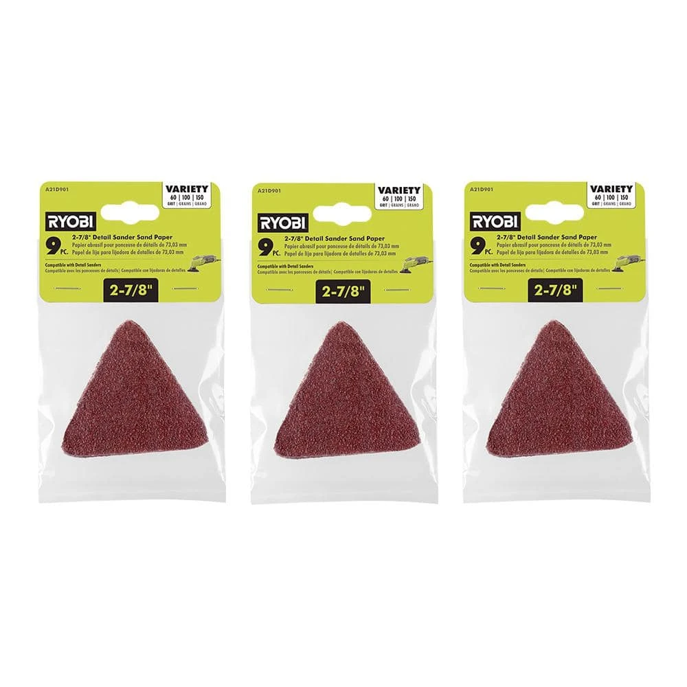 Compliment your tool collection with the RYOBI 2-7/8 in. Detail Sand Paper is compatible with all detail sanders. This set comes with multiple grit options (60 grit/100 grit/150 grit) to help tackle most jobs. The adhesive backing on each pad allows for quick and convenient changing on and off of the tool. These pads are ideal for detail sanding and allow you to sand in corners and tight spaces. This set is a great replacement for when it’s time to upgrade your previous sanding pad. Ideal for wood, metal, drywall, fiberglass and painted surfaces. This set includes (9) 60 grit 2-7/8 in. Detail Sand Paper, (9) 100 grit 2-7/8 in. Detail Sand Paper, and (9) 150 grit 2-7/8 in. Detail Sand Paper.