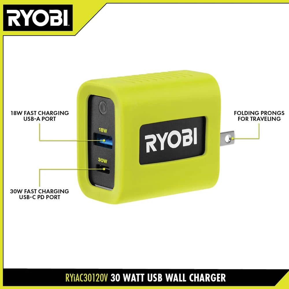 Experience fast charging with the RYOBI 30 Watt USB Wall Charger. With two charging ports, one USB-C, and one USB-A you can charge two devices at once. Whether it’s a smartphone, tablet, or any other USB device, this 2-port adapter is perfect to have when you need a charge. When traveling, conveniently fold the prongs down making it compact and easy to pack. Pair with RYOBI USB Cables for the ultimate RYOBI charging experience. Complement your tool collection with RYOBI Accessories.