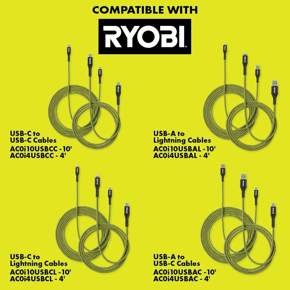 - Compatible with all RYOBI USB Cables & any other USB-C or USB-A cable