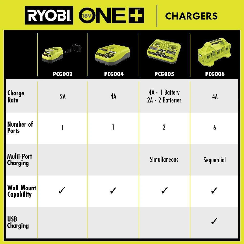 - Charger: Charge and maintain up to two RYOBI 18V ONE+ batteries at the same time