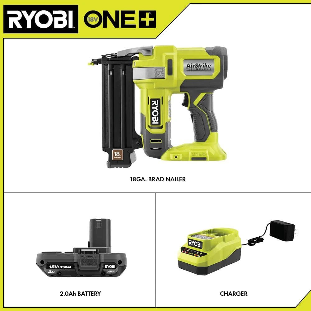 RYOBI introduces the 18V ONE+ Cordless AirStrike 18-Gauge Brad Nailer and 2.0 Ah Compact Battery and Charger Starter Kit. The included 2.0 Ah Battery and 18V Charger are compatible with all RYOBI 18V ONE+ Tools. Best of all, it is part of the RYOBI ONE+ System of over 300 Cordless Products that all work on the same battery platform. Backed by the RYOBI 3-Year Manufacturer’s Warranty, this nailer includes a belt clip, sample nails, a 2.0 Ah Battery, an 18V Charger, and an operator’s manual.