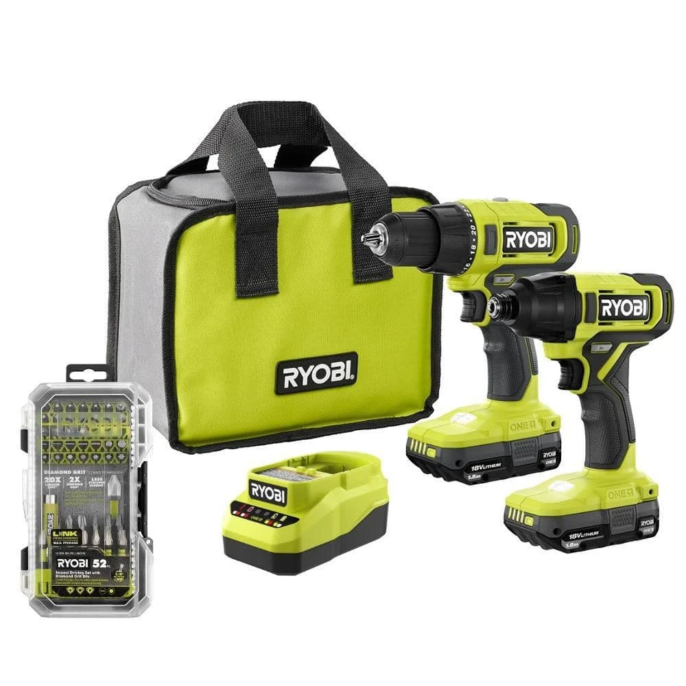 RYOBI introduces the ONE+ 18V Cordless 2-Tool Combo Kit with Drill/Driver, Impact Driver, (2) Batteries, Charger, & Driving Set (52-Piece). The ONE+ Drill/Driver provides up to 515 in./lbs. of torque and features a 1/2 in. ratcheting metal chuck to match your drilling and driving needs. The ONE+ Impact Driver is able to drive long deck screws or large lag screws with ease by delivering 3,400 IPM along with 1800 in./lbs. of torque controlled by a variable-speed trigger that churns out 2,700 RPM. The ONE+ 1.5 Ah Lithium-Ion Batteries feature an integrated high visibility fuel gauge to monitor remaining runtime. The 18V Charger is compatible with RYOBI ONE+ Lithium-ion Batteries. Best of all, this kit is part of the RYOBI ONE+ System of over 300 Cordless Products that all work on the same battery platform. Backed by the RYOBI 3-Year Manufacturer’s Warranty, the 18V ONE+ Cordless 2-Tool Combo Kit includes (1) PCL206 18V ONE+ Cordless 1/2 in. Drill/Driver, (1) PCL235 18V ONE+ Cordless 1/4 in. Impact Driver, (2) PBP002 18V 1.5 Ah Lithium-ion Batteries, (1) 18V Charger, Tool Bag, Diamond Grit Driving Set (52-Piece), and Operator’s Manuals.