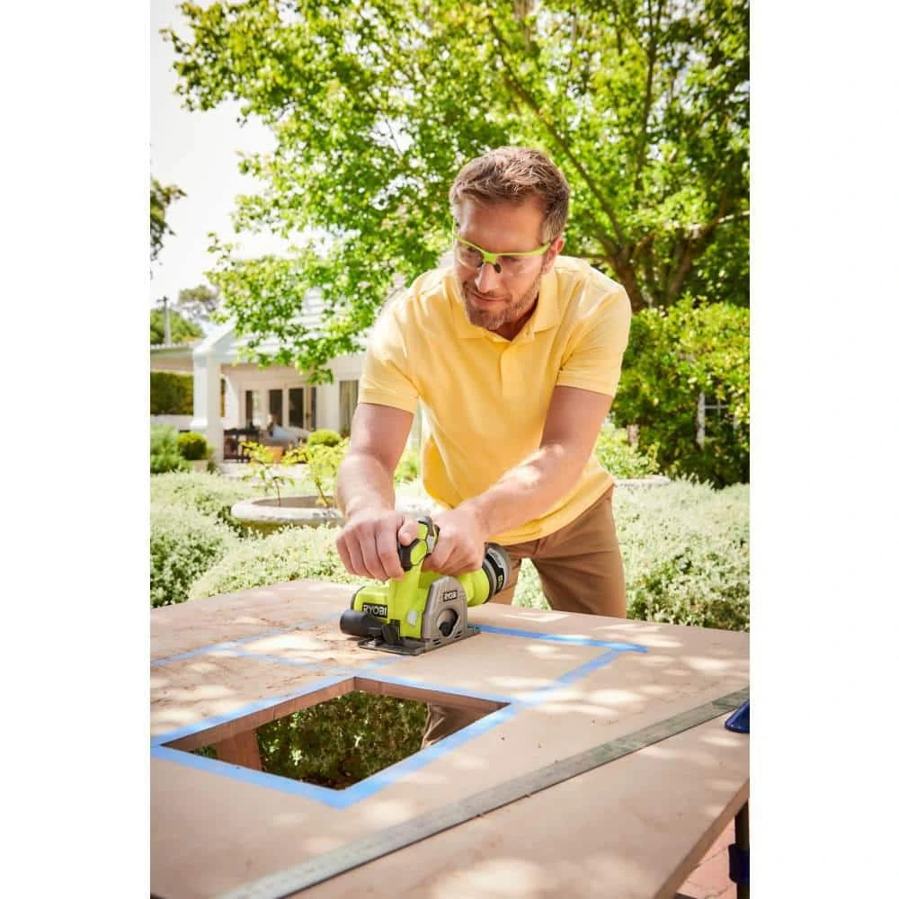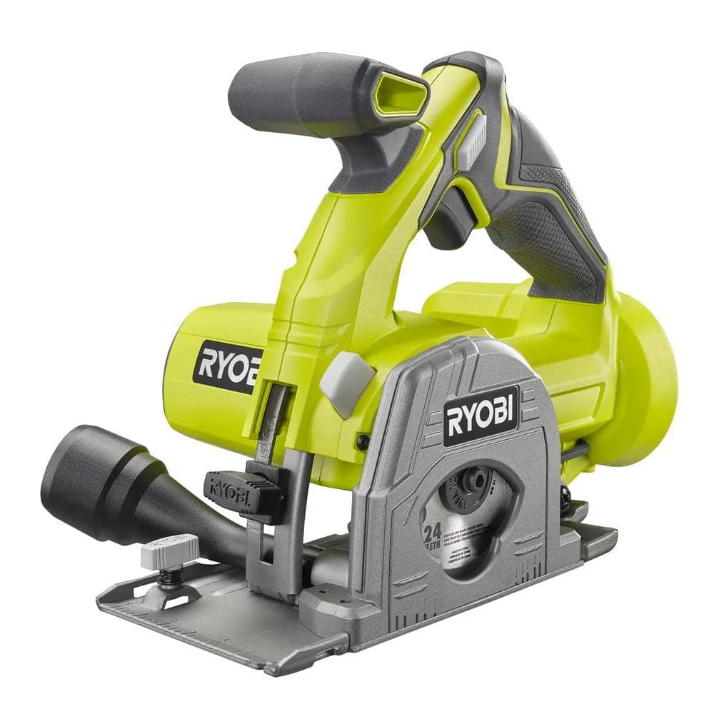 RYOBI introduces the 18V ONE+ Cordless 3-3/8 in. Multi-Material Plunge Saw (Tool Only). The saw is best suited for cutting sheet goods like plywood, thin non-ferrous metal, and for small or quick tile cuts. The multi-material saw includes three 3-3/8 in. specialty blades that offer the ability to cut through these various types of material. The light weight and compact size of this multi-material saw makes it ideal for plunge and straight cuts in tight spaces. The robust motor performs at speeds up to 4,200 RPM which provides the strength and power to cut through many different building materials. The variable plunge depth settings can be adjusted up to 1 in. deep. The included dust port allows users the ability to keep dust under control by connecting to a wet/dry vac. Best of all, it’s a part of the RYOBI 18V ONE+ System of over 300 Cordless Products that all work on the same battery platform. Backed by the RYOBI 3-Year Manufacturer’s Warranty, the 18V ONE+ Cordless 3-3/8 in. Multi-Material Plunge Saw includes an edge guide, dust port, Allen wrench, 3-3/8 in.24-tooth wood blade, 3-3/8 in. diamond abrasive blade, 3-3/8 in. HSS metal blade, and an operator’s manual. Battery and charger sold separately.