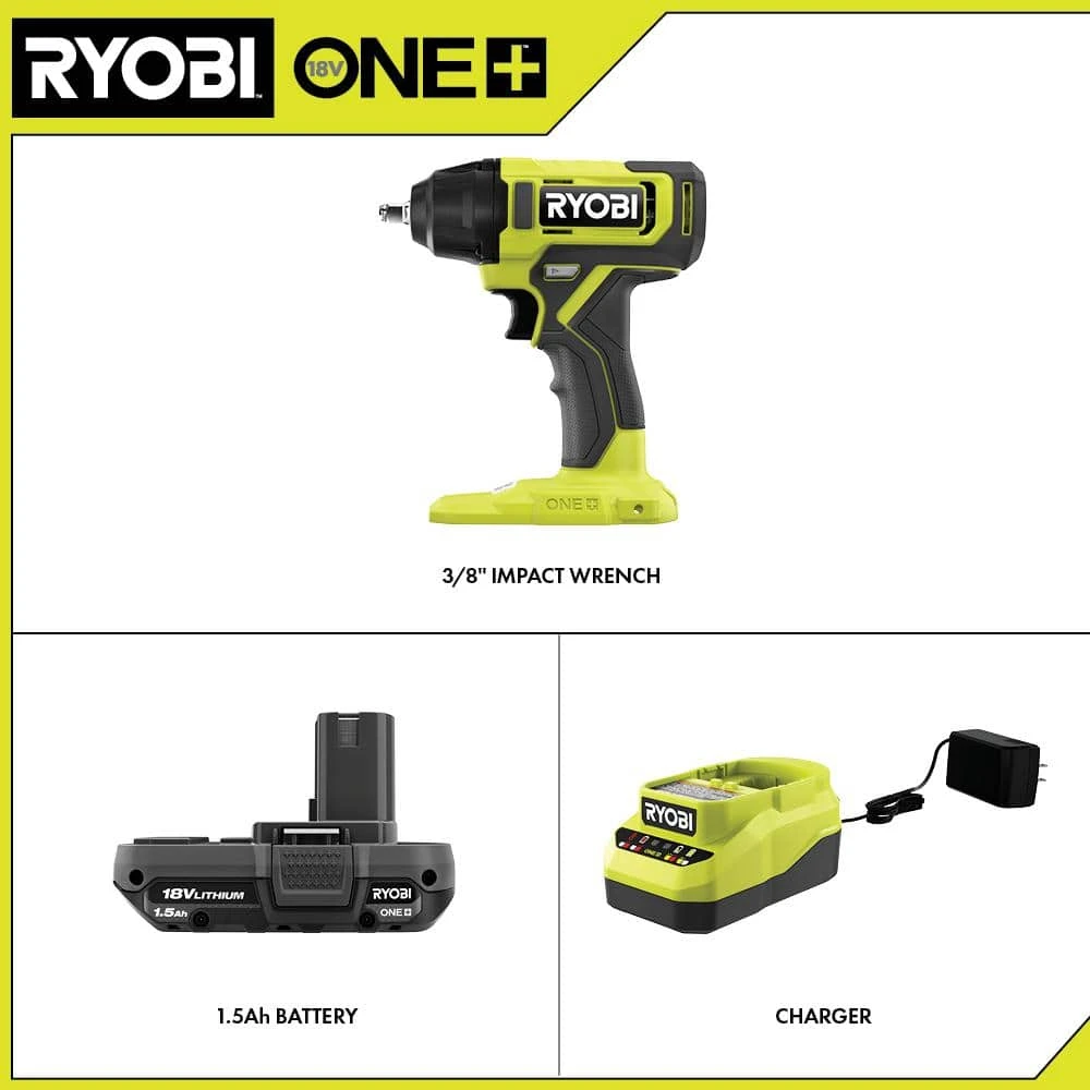 RYOBI introduces the 18V ONE+ Cordless 3/8 in. Impact Wrench Kit with (1) 1.5 Ah Battery and Charger. Producing 220 ft./lbs, the 3/8 impact wrench produces provides up to 3,100 impacts per minute. The 3/8 in. anvil friction rings allows for efficient socket changes. The on-board LED worklight create additional visibility for all of your projects. This tool is perfect for a variety of automotive applications. The included battery and charger are compatible with all RYOBI 18V Tools. Best of all, it is part of the RYOBI 18V ONE+ System of over 300 Cordless Products that all work on the same battery platform. This 18V ONE+ Cordless 3/8 in. Impact Wrench is backed by the RYOBI 3-Year Manufacturer’s Warranty and includes (1) 1.5 Ah Battery, 18V Charger, and operator’s manual.