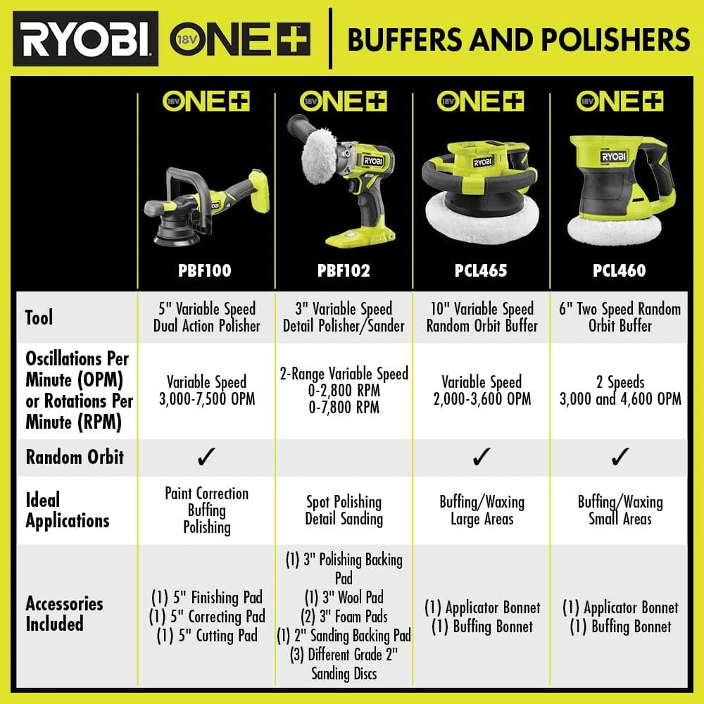 RYOBI introduces the 18V ONE+ Cordless 6 in. Two Speed Random Orbit Buffer Kit with 2.0 Ah Battery and Charger. This tool has the capability to buff a mid-sized vehicle with up to 2 hours of runtime. The compact and lightweight design allows the user to have increased accessibility and comfort when working on contoured and detailed surfaces. Providing up to 4,600 OPM, this buffer combines power and random orbit motion to leave a swirl-free finish. Also featured is a two speed switch and D-handle for enhanced control and extended reach. The included battery and charger are compatible with all RYOBI 18V ONE+ Tools. Best of all, it is part of the RYOBI 18V ONE+ System of over 300 Cordless Products that all work on the same battery platform. This 18V ONE+ 6 in. Two Speed Orbital Buffer is backed by the RYOBI 3-Year Manufacturer’s Warranty and includes (1) PCL460 18V ONE+ 6 in. Two Speed Orbital Buffer, Applicator Bonnet, Buffing Bonnet, 2.0 Ah Battery, 18V Charger, and Operator’s Manual.
