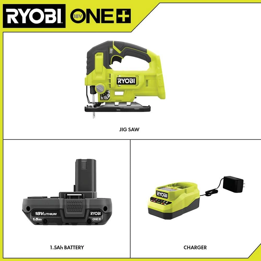Expand your RYOBI 18V ONE+ System with the RYOBI 18V ONE+ Cordless Jig Saw Kit with 1.5 Ah Battery, Charger, and All Purpose Jig Saw Blade Set (10-Piece). The variable speed trigger provides fast, precise cuts with up to 3,000 SPM. With 30% less vibration, users will have ultimate cut control and reduced fatigue. Blade changes are quick and easy with tool-free blade release. This jig saw is feature packed with 4 orbital settings, on board LED worklight and non-marring shoe. This 18V ONE+ Cordless Jig Saw accepts and comes with (1) T-Shank wood cutting blade. The included battery and charger are compatible with all RYOBI 18V ONE+ Tools. Best of all, it is part of the RYOBI ONE+ System of over 300 Cordless Products that all work on the same battery platform. This 18V ONE+ Cordless Jig Saw is backed by the RYOBI 3-Year Manufacturer’s Warranty, and includes a 1.5 Ah Battery, an 18V Charger, All Purpose Jig Saw Blade Set (10-Piece), and an operator’s manual.