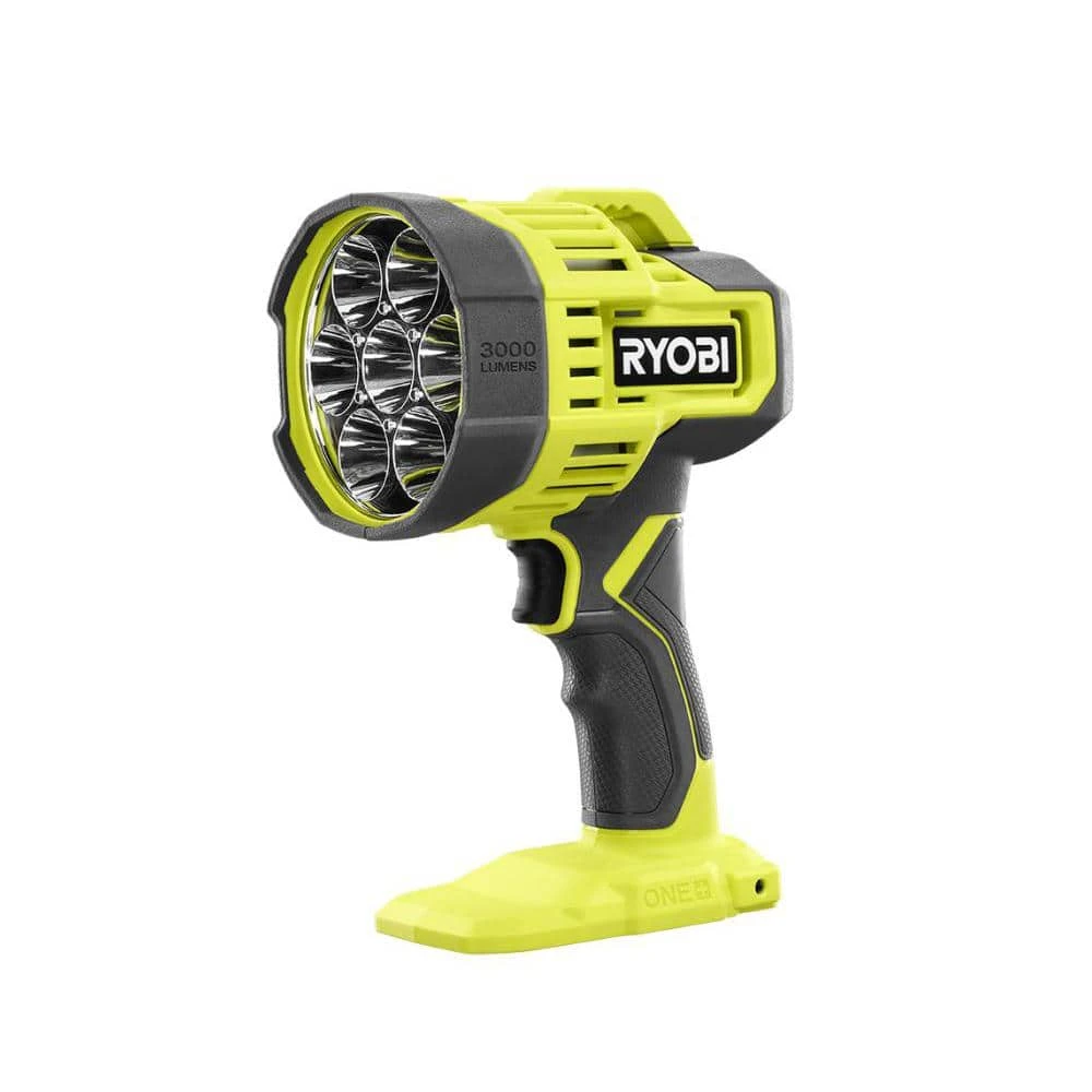 Expand your RYOBI 18V ONE+ System with the RYOBI 18V ONE+ LED Spotlight. Illuminate large distances with over 3,000 Lumens of LED light output and a 650 yard beam distance. The 18V ONE+ LED Spotlight runs up 7 hours on low using the RYOBI PBP005 4.0 Ah Battery. We’ve upgraded this light with 3 mode settings (high/medium/low) while also making it 26% more compact than our previous model. A unique feature of this spotlight is its hanging loop for convenient storage with the added capability of being used on its sides and back. Best of all, it is part of the RYOBI ONE+ System of over 300 Cordless Products that all work on the same battery platform. This RYOBI 18V ONE+ LED Spotlight is backed by the RYOBI 3-Year Manufacturer’s Warranty and includes (1) PCL661 18V ONE+ LED Spotlight and (1) Operator’s Manual. Battery and charger sold separately.
