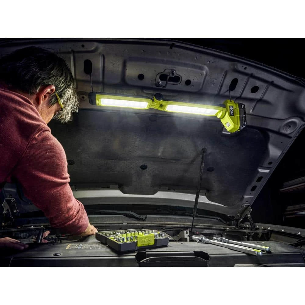 The18V ONE+ LED Workbench Light Kit improves your workspace with RYOBI’s most versatile lighting solution. It has 75% brighter output with up to 1,700 lumens and 4 unique brightness modes: top and bottom panel (high/low), top panel only (high/low). Illuminate any environment with a 270° light panel pivot and 360° panel rotation. With high efficiency LED’s providing up to 16 hours of uninterrupted runtime, this guarantees reliable illumination regardless of the lighting conditions. Versatile and convenient 2-by capable metal folding hooks provide multiple mounting options for any workspace. Part of the RYOBI ONE+ System – Any 18V ONE+ Battery Works With Any 18V ONE+ Product. This 18V ONE+ LED Workbench Light Kit is backed by the RYOBI 3-Year Manufacturer’s Warranty and includes PCL667 18V ONE+ LED Workbench Light, PBP005 18V ONE+ 4Ah Lithium Battery, PBP006 18V ONE+ 2Ah battery, Charger and Operator’s Manuals.