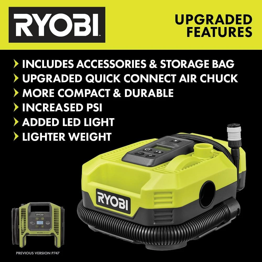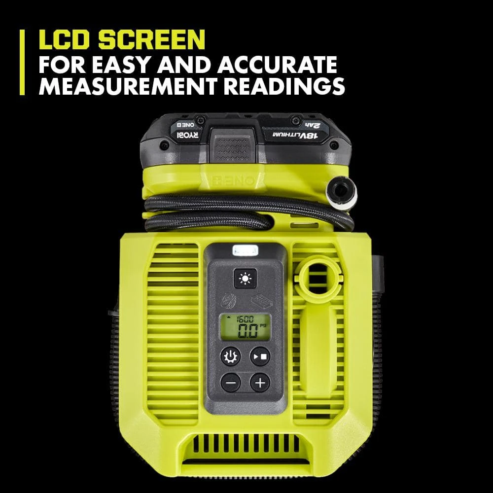 The RYOBI 18V ONE+ Dual Function Digital Inflator is ideal for a variety of applications ranging from filling tires/sports balls to inflation and deflation of air mattresses and pool toys. The high pressure inflation of up to 160 PSI and high volume inflation up to 16 SCFM ensure quicker and more efficient inflation. Filling tires is easier than ever with auto shut-off and the quick-connect air chuck for hands-free use. A digital pressure gauge provides clear and accurate measurement readings and the bright LED worklight allows for clear visibility no matter the environment. Take this inflator anywhere with the integrated carry handle and on-board accessory storage. Best of all, it is part of the RYOBI ONE+ System – Any 18V ONE+ Battery Works With Any 18V ONE+ Product. This 18V ONE+ Dual Function Digital Inflator/Deflator is backed by the RYOBI 3-Year Manufacturer’s Warranty and includes PCL031K1 18V ONE+ Dual Function Digital Inflator/Deflator, Battery, Charger, Sports Needle, Presta Valve Adaptor, Pinch Valve Adaptor and Operator’s Manual.