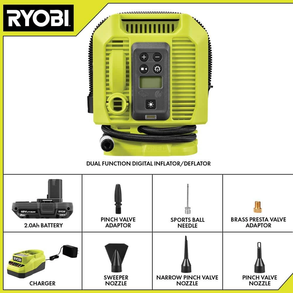 - Includes: 18V ONE+ Dual Function Digital Inflator/Deflator, High Pressure Hose, High Volume Nozzle, Sweeper Nozzle, Narrow Pinch Valve Nozzle, Pinch Valve Nozzle, Pinch Valve Adaptor, Sports Ball Needle, Brass Presta Valve Adaptor, Drawstring Accessory Bag, Battery, Charger, and Operator’s Manual