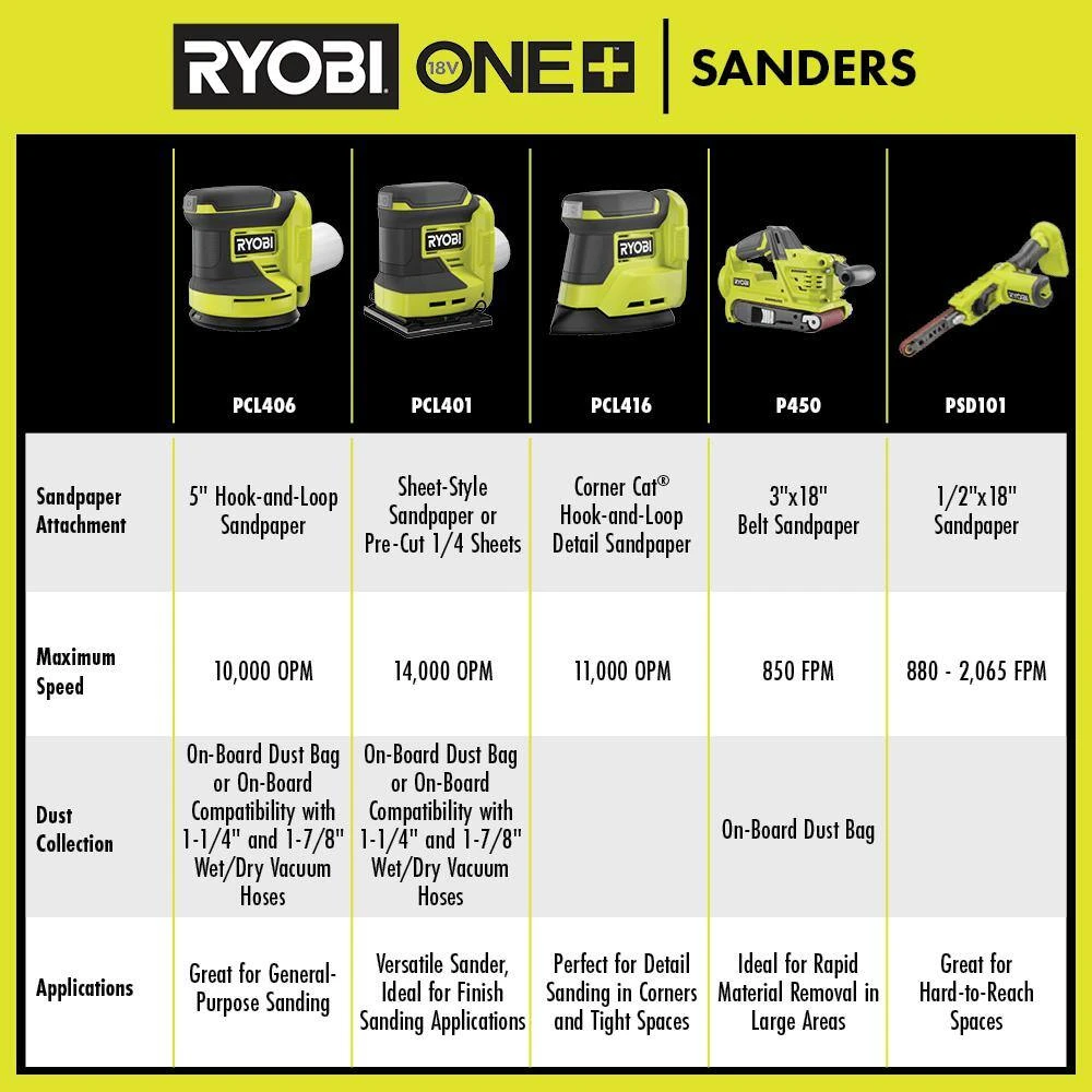 - Includes: (1) PCL416 18V ONE+ Cordless Corner Cat Sander, (3) pieces of sandpaper, and operator’s manual