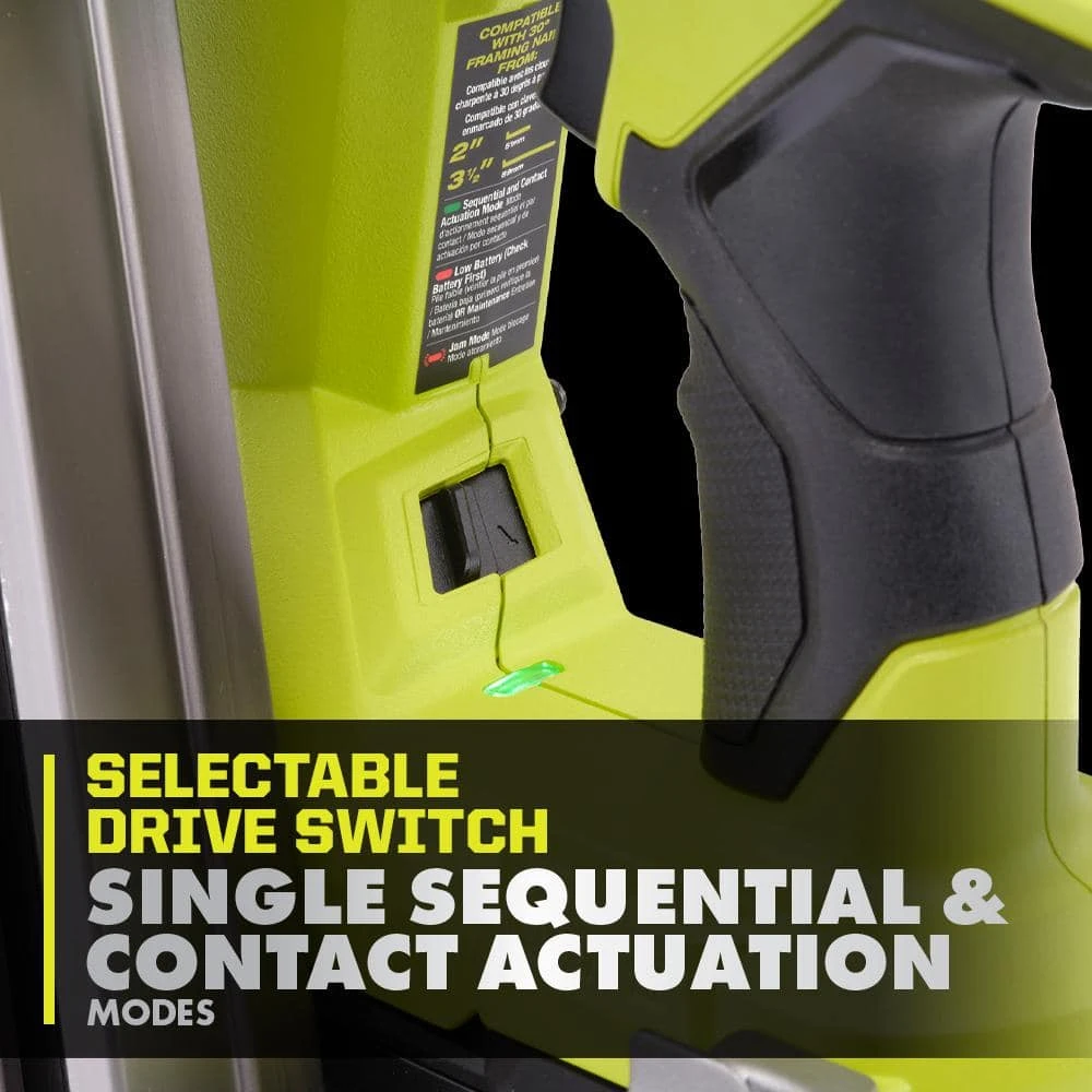 Enhance your RYOBI 18V ONE+ System with the 18V ONE+ HP Brushless 30° Framing Nailer. ONE+ HP Technology delivers more power, runtime, durability and speed utilizing brushless motors, advanced electronics and HIGH PERFORMANCE lithium technology. Enjoy the convenience of AirStrike Technology, eliminating the need for noisy compressors, bulky hoses and expensive gas cartridges. This cordless framing nailer provides instant driving speed and the ability to drive up to 750 nails per charge on a 4.0 Ah HIGH PERFORMANCE battery (sold separately). The selectable drive switch allows you to choose between single sequential and contact actuation modes, for either precise or rapid, repetitive nail placement. This framing nailer delivers the power to sink up to 3-1/2 in. clipped or full head nails. The tool-free depth of drive adjustment ensures that you are able to drive nails flush every time, even in the most dense materials. The on-board air fill valve enables field serviceability, which results in decreased downtime for you and your crew, and the integrated rafter hook allows for safe and easy on the job storage. Best of all, it is part of the RYOBI 18V ONE+ System of over 300 Cordless Products that all work on the same battery platform. The 18V ONE+ HP Brushless 30° Framing Nailer is backed by the RYOBI 3-Year Manufacturer’s Warranty and includes the 18V framing nailer, rafter hook, belt hook, hex key, non-marring pad and operator’s manual. Battery and charger sold separately.