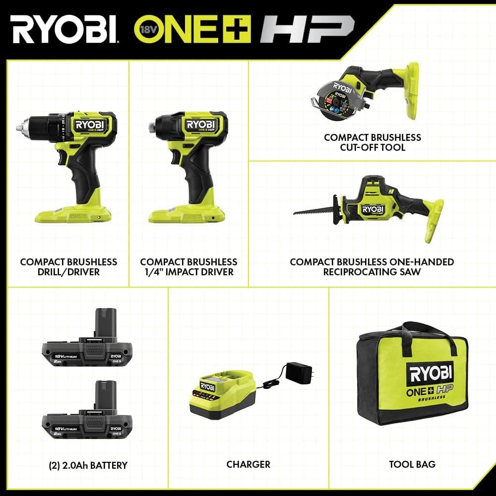 Enter the RYOBI 18V ONE+ System with the RYOBI 18V ONE+ HP Compact Brushless 4-Tool Combo Kit – 1/2 in. Drill/Driver, 1/4 in. Impact Driver, One-Handed Recip Saw, Cut-Off Tool, (2) 18V ONE+ 2.0 Ah Lithium-ion Battery, Charger and Tool Bag. ONE+ HP Technology delivers more power, runtime, durability, and speed utilizing brushless motors, advanced electronics, and HIGH PERFORMANCE lithium technology. Our compact tools are the lightest and smallest we have ever made, while still delivering optimal power to get the job done. The 1/2 in. Drill/Driver is just 6.4 in. in length and delivers 400 in./lbs. of torque. The 1/4 in. Impact Driver delivers up to 1,700 in./lbs. of torque and up to 3,800 IPM. The One-Handed Recip Saw is 13 in. in length and delivers speeds of up to 3,000 SPM. The Cut-Off Tool produces up to 19,500 RPM to cut through tough materials like metal, plastic, tile, cement board, drywall, wire shelving, PVC and vinyl siding. The 18V ONE+ 2.0 Ah Lithium-ion Batteries feature an integrated high visibility fuel gauge to monitor remaining runtime. Best of all, this kit is part of the RYOBI 18V ONE+ System of over 300 Cordless Products that all work on the same battery platform. Backed by the RYOBI 3-Year Manufacturer’s Warranty.