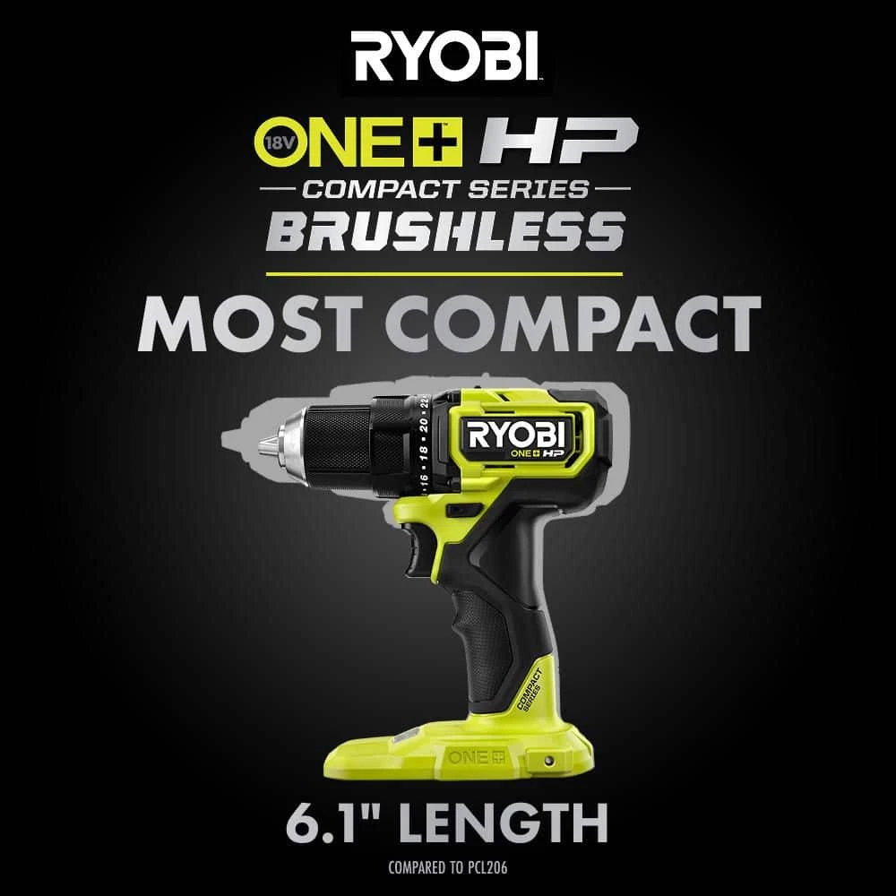 RYOBI introduces the 18V ONE+ HP Compact Brushless 1/2 in. Drill/Driver Kit. This next generation of ONE+ HP compact brushless tools utilizes ONE+ HP Brushless technology to deliver more power, longer runtime, and longer motor life. Measuring at only 6.1