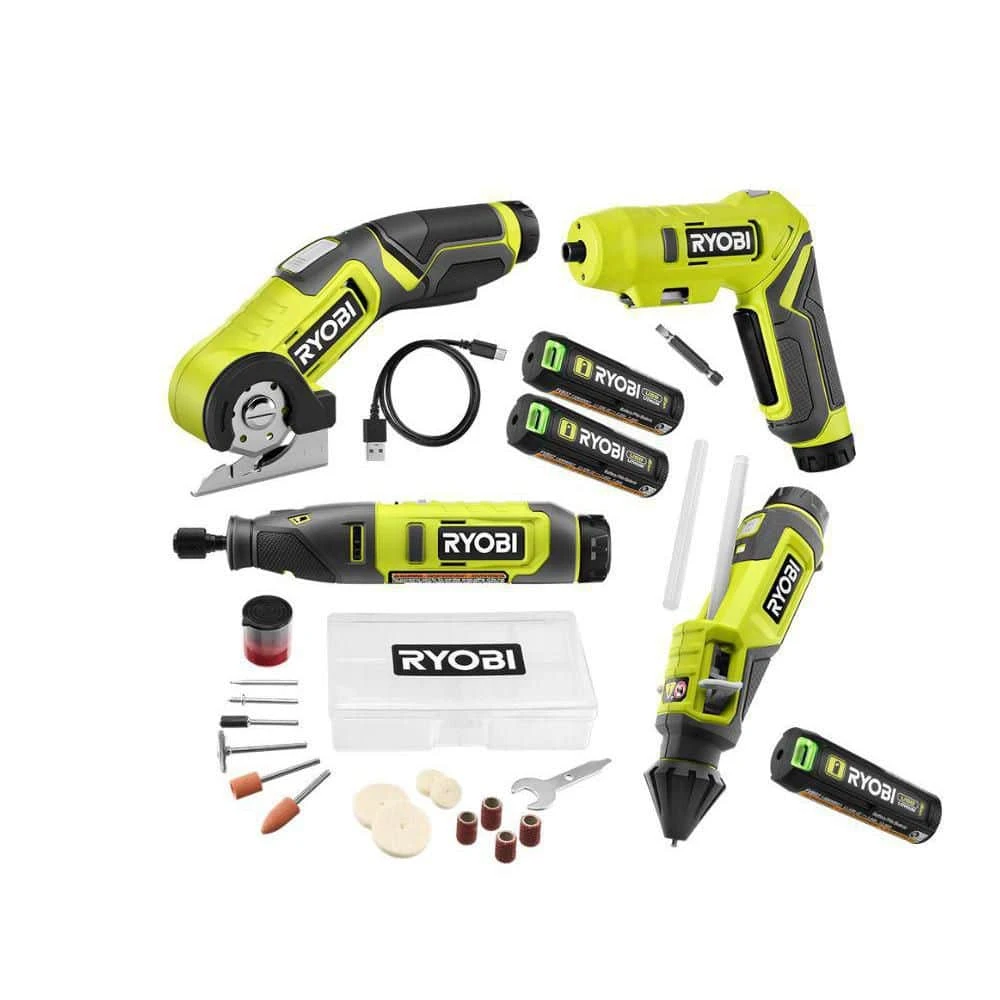The RYOBI USB Lithium 4-Tool Combo Kit joins the USB Lithium system and will elevate your crafts with rechargeable power for everyday solutions. UFeaturing a pivoting head and LED worklight, the screwdriver allows for increased visibility and accessibility. The rotary tool features an innovative Quick-Change Collet with 4X faster accessory changes, which makes switching accessories quick and easy. With a self-sharpening blade, the power cutter powers through a variety of materials. The glue pen features rapid heat up in under 30 seconds with a LED indicator light letting you know it is ready to use. These products feature an LED indicator to signal when the battery is charged (green) or has low battery (red) while in-use. Best of all, it is part of the RYOBI USB Lithium System of tools that provides compact, portable and rechargeable solutions for cordless power and productivity. This USB Lithium Tool 4-Tool Combo Kit is backed by the RYOBI 2-Year Manufacturer’s Warranty and includes FVD50 USB Lithium Screwdriver, FVL56 USB Lithium LED Inspection Light, FVH56 USB Lithium Glue Pen, FVM51 USB Lithium Rotary Tool, (2) FVB02 USB Lithium 2Ah Lithium Rechargeable Batteries, USB Cable, (2) Screwdriver Bits, Drip Tray Stand, (3) Mini Glue Sticks, (15) Rotary Accessories, Wrench, Bit Case, and and (2) USB Lithium 3.0 Ah Batteries.