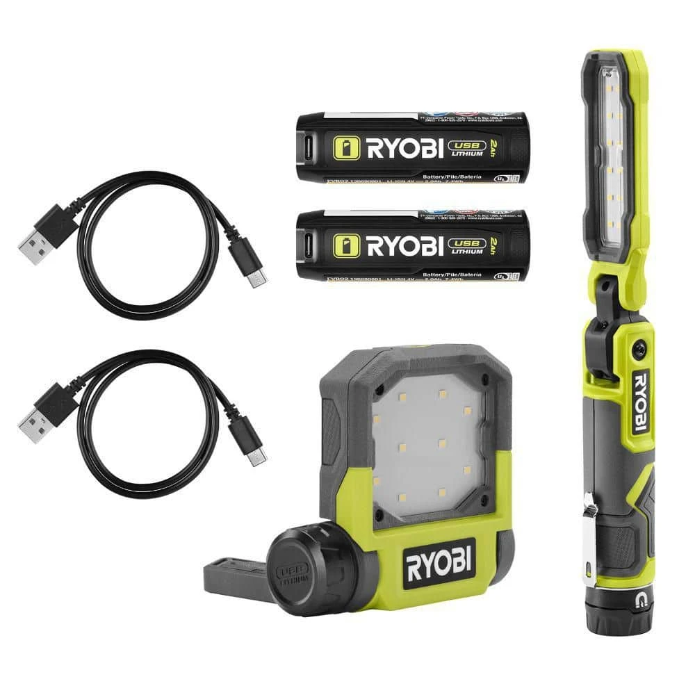 RYOBI introduces the USB Lithium Cordless Inspection Flashlight and Pivoting LED 3-Mode Flip Light Kit with (2) Batteries and Charging Cables. With up to 550 Lumens of 90+ high color render index light output and 3 light modes, this USB Lithium LED Inspection Light provides clear, bright and accurate color clarity in a durable compact design. This high color render light provides up to 32 hours of runtime and is the perfect solution for applications where seeing accurate color is crucial. This USB Lithium LED Flip Light provides 500 Lumens and has 3 light modes to provide the ideal amount of light needed every time. Mount and direct your light exactly where you need it with its pivoting stand, magnetic base, and 2-by mounting capability. This light delivers over 24 hours of clear coverage. Best of all, it is part of the RYOBI USB Lithium System of tools that provides compact, rechargeable, everyday solutions for cordless power and productivity. This USB Lithium Kit is backed by the RYOBI 2-Year Manufacturer’s Warranty and includes FVL56 LED Inspection Light, USB Lithium 2Ah Battery, USB Cable, FVL52 LED Flip Light, USB Lithium 2Ah Battery, USB Cable and Operator’s Manuals.