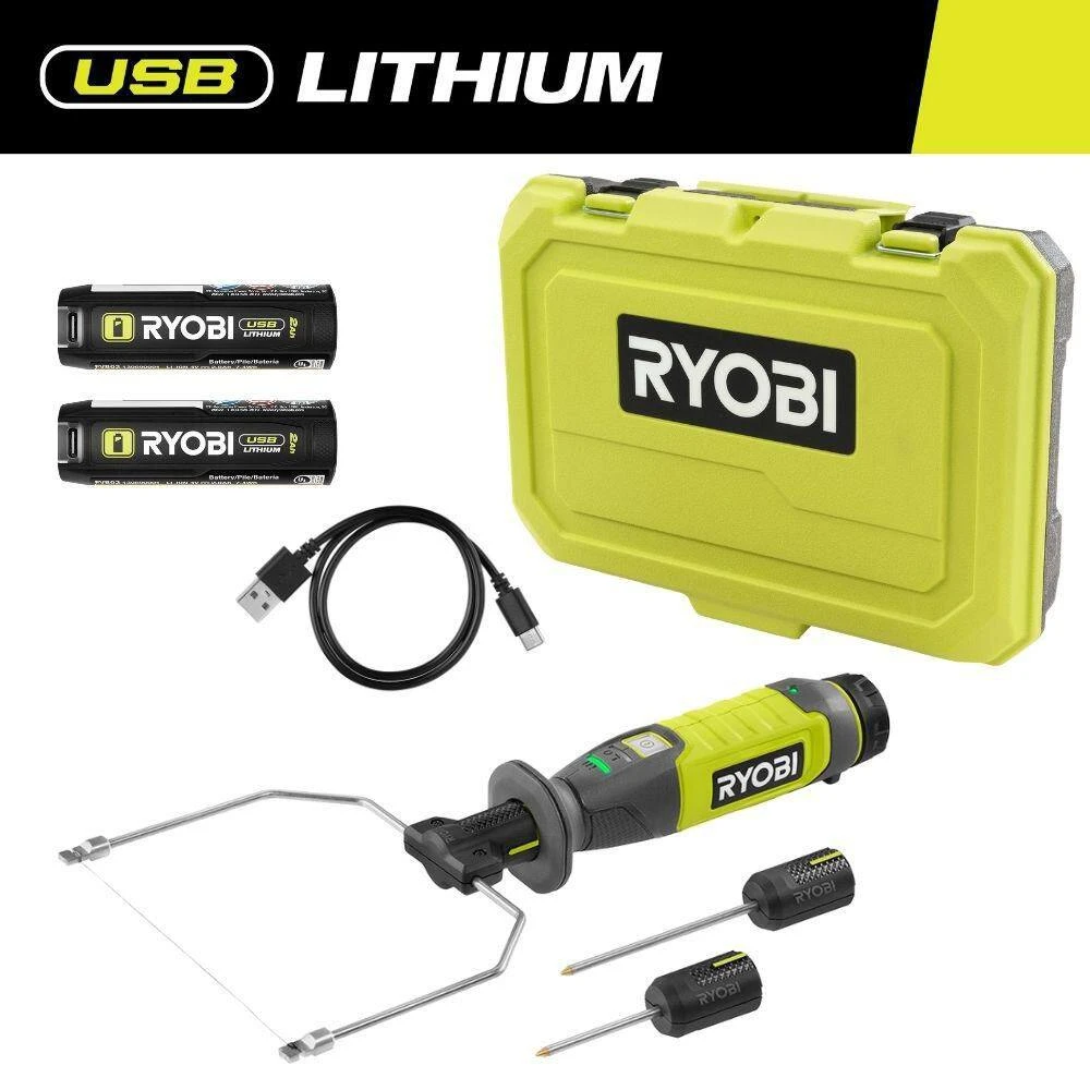 RYOBI introduces the USB Lithium Foam Cutter Kit with 2.0 Ah Battery, Charging Cable, and USB Lithium 2.0 Ah Batteries (2-Pack). This tool cuts, shapes and shaves a variety of foam. Rapidly heating up in under 2 minutes, this tool is ready when you are. The dual heat settings give you precision temperature control to adjust based on your project needs. This kit includes 3 different tips for a variety of applications. The Hot Wire Tip is ideal for carving, slicing, or shaping foam such as upholstery foam when up-cycling furniture or Styrofoam for a DIY project. The Precision Engraving Tip adds texture or detail to your designs. The Holing Tip is ideal for cutting out shapes or hole digging into Styrofoam. Eliminate downtime with the convenient tool-free tip change. This product features an LED indicator to signal when the tool is heating up, as well as indicate battery charge status. Best of all, it is part of the RYOBI USB Lithium System of tools that provides compact, portable and rechargeable solutions for cordless power and productivity. The USB Lithium Foam Cutter Kit is backed by the RYOBI 2-Year Manufacturer’s Warranty and includes a USB Lithium 2Ah Battery, Nichrome Wire, Hot Wire Tip, Precision Engraving Tip, Holing Tip, Stand, USB Cable and Operator’s Manuals and is packaged in a hard case for organization and convenience.